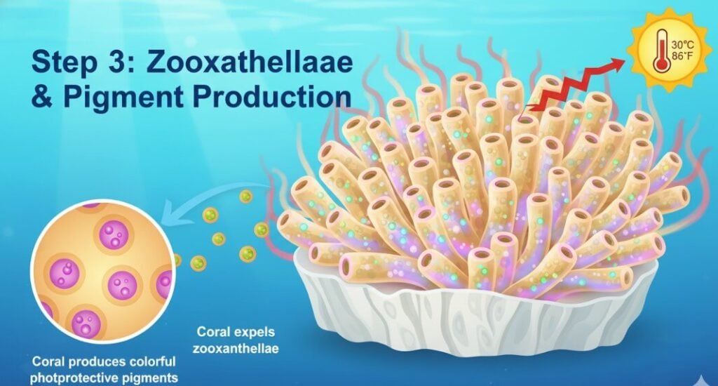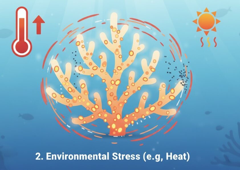 When the ocean environment becomes too stressful, primarily due to heat, this symbiotic relationship breaks down. The zooxanthellae begin to produce reactive oxygen species that are harmful to the coral.