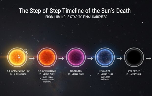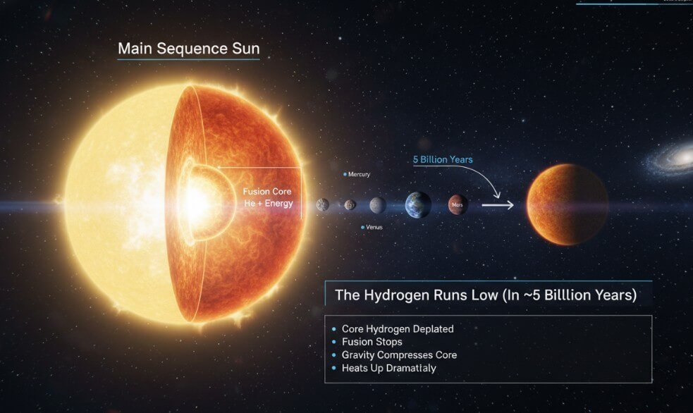 - The Hydrogen Runs Low (In ~5 Billion Years): After the sun converts all the hydrogen in its core to helium, the fusion process will stop. With the outward pressure gone, gravity will take over and begin to compress the core, causing it to heat up dramatically.