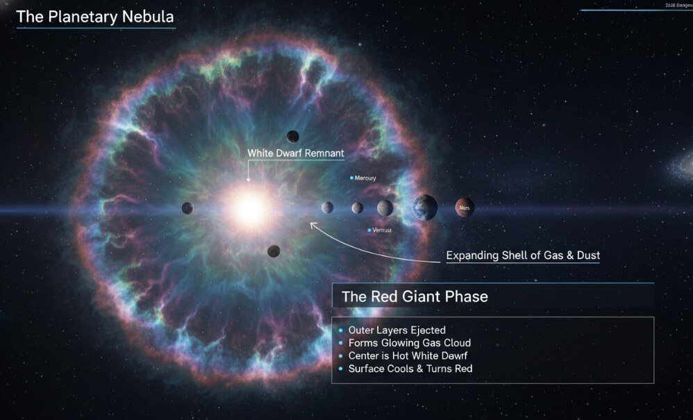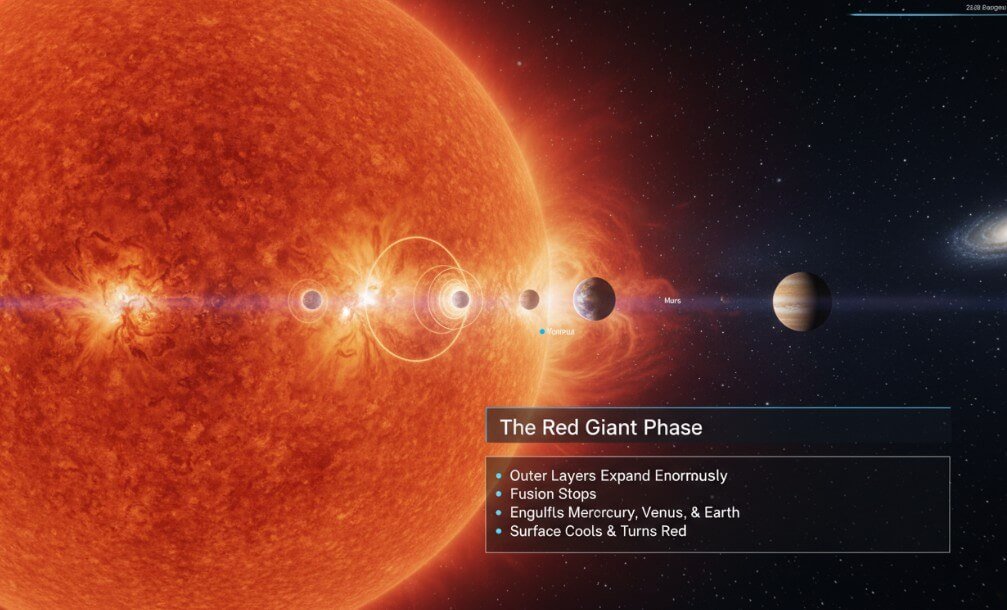 - The Red Giant Phase: This new heat will cause the sun’s outer layers to expand enormously, swelling to a size that will engulf the orbits of Mercury, Venus, and very likely Earth. As it expands, its surface will cool, turning it into a luminous but terrifying Red Giant.