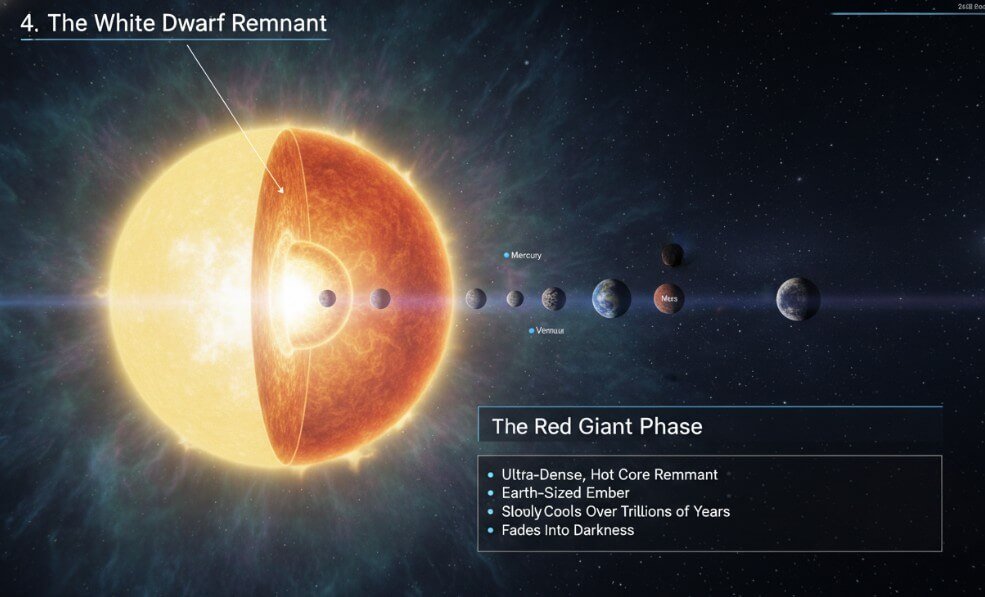 - The White Dwarf Remnant: All that will remain of our sun is its ultra-dense, scorching hot core, a stellar remnant called a White Dwarf. This Earth-sized ember will have the mass of about half the original sun. With no fuel left to burn, it will simply cool down and fade over trillions of years.